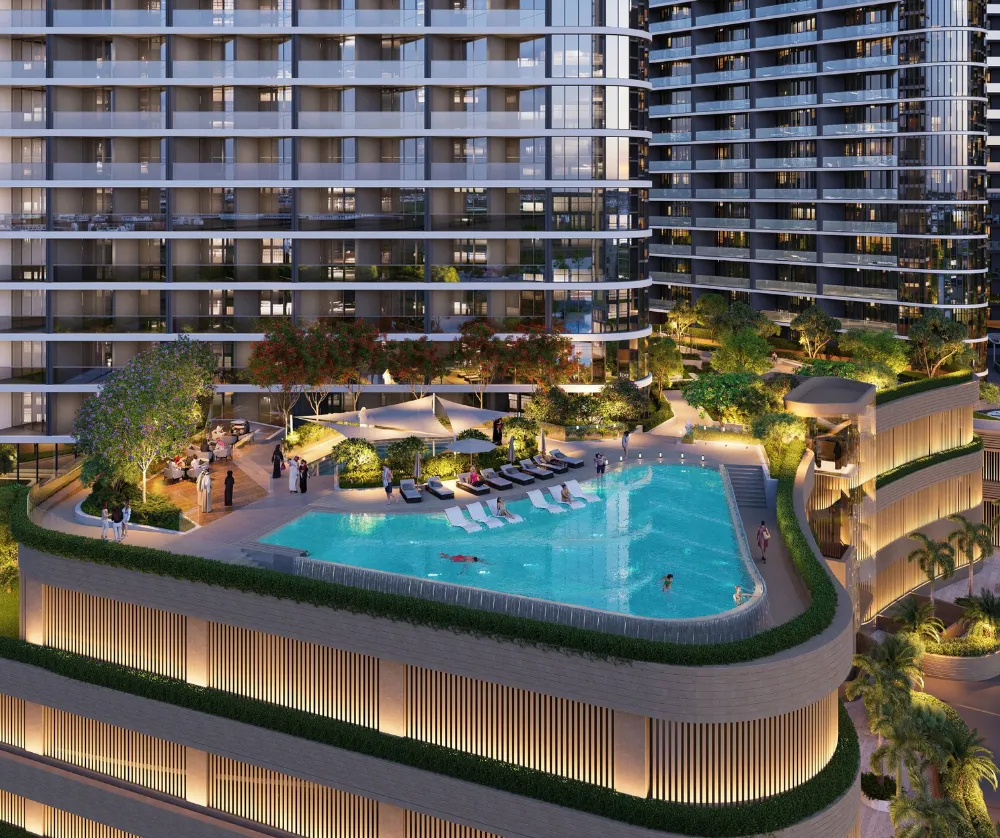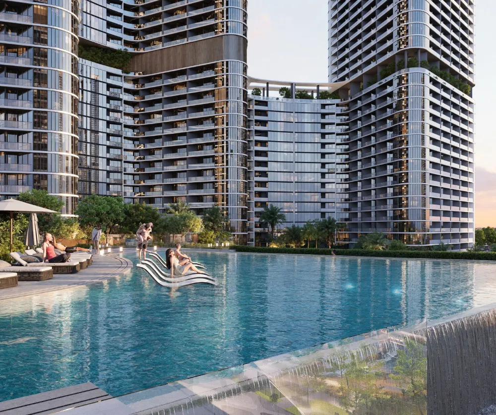 - Shared amenities across 4 towers including infinity pools, jacuzzis, and central water features.